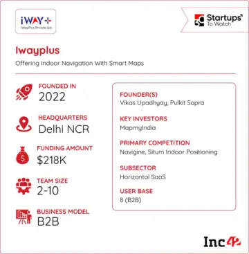Founded in 2022 by Vikas Upadhyay and Pulkit Sapra, and incubated at IIT Delhi's Assistech Lab, Iwayplus builds indoor mapping, positioning and navigation solutions for complex enclosed spaces.