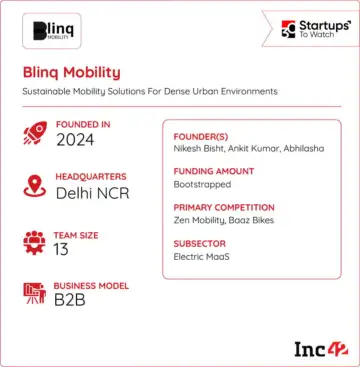 Founded in 2024 by Nikesh Bisht, Ankit Kumar, Abhilasha Marmat, Sushmita Patil and Yashdeep Singh, Blinq Mobility is building sustainable mobility solutions for dense urban environments.
