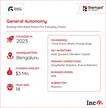 Founded in 2023 by ShareChat cofounders Farid Ahsan and Bhanu Pratap Singh, Bengaluru-based General Autonomy is building autonomous and semi-autonomous robots for everyday and industrial use cases.