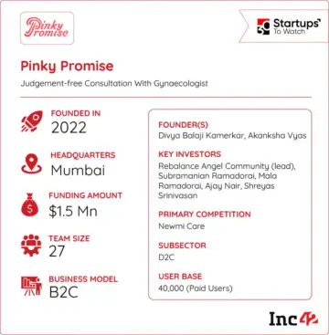 By reducing barriers around cost, privacy and access, the startup aims to make women's healthcare more inclusive across income groups and geographies. Pinky Promise claims to have served over 3.5 Lakh users since its inception and is targeting India's fast-growing telemedicine market, which is expected to reach around $20 Bn by 2033.