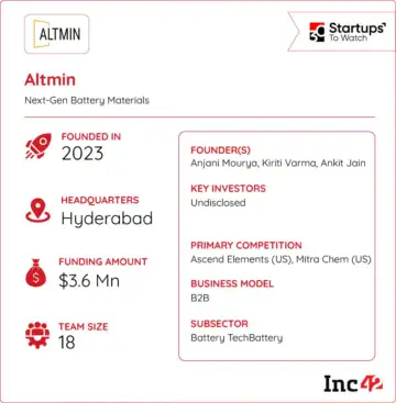 In December, Altmin signed an MoU with Singareni Collieries Company and the Government of Telangana to build the INR 2,250 Cr facility. India's lithium-ion battery cathode market is projected to grow to over $3.2 Bn by 2030.