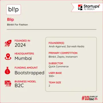 Founded in 2024, Blip is a hyperlocal quick-commerce platform that delivers clothes in 30 minutes. It partners with various brands specific to localities and operates a series of strategically placed dark stores to ensure quick deliveries.