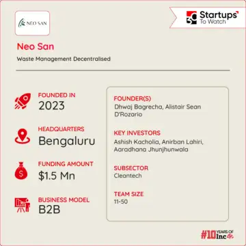 Founded by Dhwaj Bagrecha and Alistair Sean D’Rozario in 2022, Neo San addresses hazardous waste management with innovative solutions using proprietary technology.