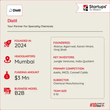 Its flagship offerings focus on consistent quality, tech-enabled purchasing convenience, on-time delivery, and strong after-sales support. Though its products are not patented, Distil operates on an inventory-based revenue model, primarily focussing on direct sales of speciality chemicals.
