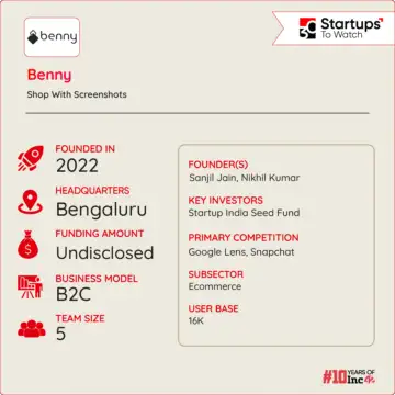 Founded by IIT Roorkee alumni Sanjil Jain and Nikhil Kumar, Benny is an AI-driven shopping platform that allows users to upload any image and instantly find matching apparel from over 160 leading online stores.