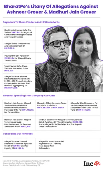 In early May, the company's criminal complaint against the Grovers and members of Madhuri's family was registered by the Delhi Police's Economic Offences Wing. The FIR alleges a fraud of INR 81 Cr by Madhuri, Ashneer, Madhuri's father Suresh Jain, her brother Shwetank Jain and her brother-in-law Dipak Gupta. And in response, Grover almost immediately and dramatically claimed that the company is a $3 Bn write-off.