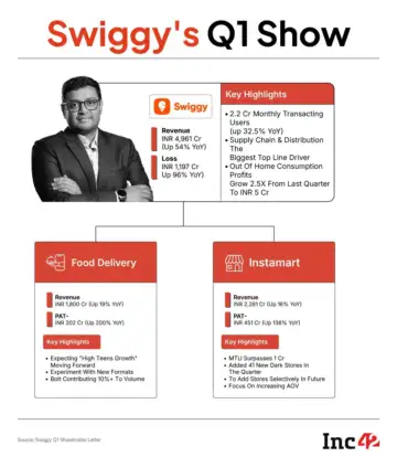 Consequently, the profit of the vertical declined to INR 202 Cr in Q1 from INR 220 Cr in the preceding March quarter. This is a red flag, as food delivery helps Swiggy offset the losses of its quick commerce arm Instamart.