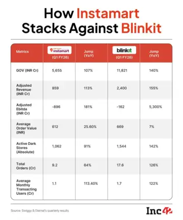 More importantly, Blinkit's adjusted EBITDA margins are much better than that of Instamart's. After reporting an adjusted EBITDA margin of -2.4% in Q4 FY25, the worst in four quarters, Blinkit's adjusted EBITDA margin improved to -1.8% in Q1 of FY26.