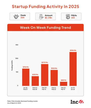 - Between March 3 and 8, Indian startups cumulatively raised $385.5 Mn across 29 deals. This is over 4X of the $88.3 Mn raised by 16 startups in the preceding week