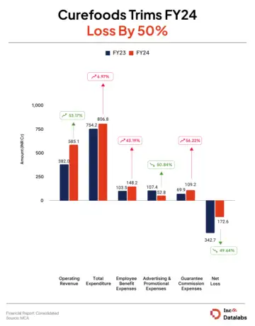 Advertising & Promotional Expenses: In a bid to cut its losses, Curefoods trimmed advertising and promotional spending by 50.84% to INR 52.8 Cr from INR 107.4 Cr in FY23.