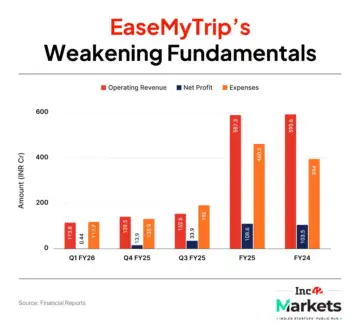 It must be noted that ixigo's core vertical is train booking, which saw 29% growth in revenue, while flight booking surged 149% YoY to surpass INR 103 Cr in Q1 FY26. In comparison to EMT, ixigo's dependency on flight ticketing is very minimal, and this explains why the revenue has not fallen as much as it has for EMT.