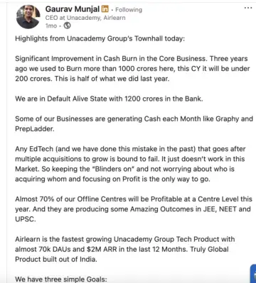 Unacademy's growth trajectory for FY25 is not clear. Munjal posted on social media last year with some hints about revenue milestones, margins, cash flow at Unacademy, but these numbers for FY25 are not backed by filings.