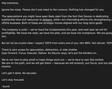In an internal mail to Unacademy's employees, Jain said the company operations will be running smoothly and that employees should not listen to the noise around the exits.