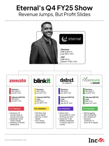 Deepinder Goyal-led Eternal’s consolidated profit after tax (PAT) plunged 77.8% to INR 39 Cr in Q4 FY25 from INR 175 Cr in the year-ago period, as quick commerce vertical Blinkit continued to see a rise in its loss amid high competition.