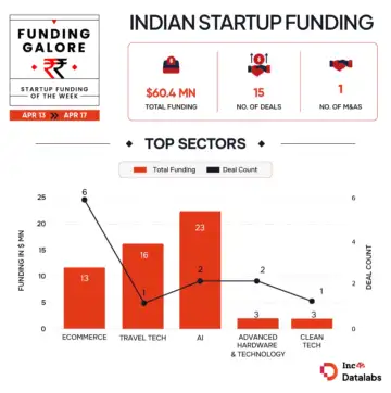 Funding activity in the Indian startup ecosystem took a sharp hit this week. Homegrown new-age tech companies collectively managed to raise just $60.4 Mn across 15 deals between April 13 and 17.