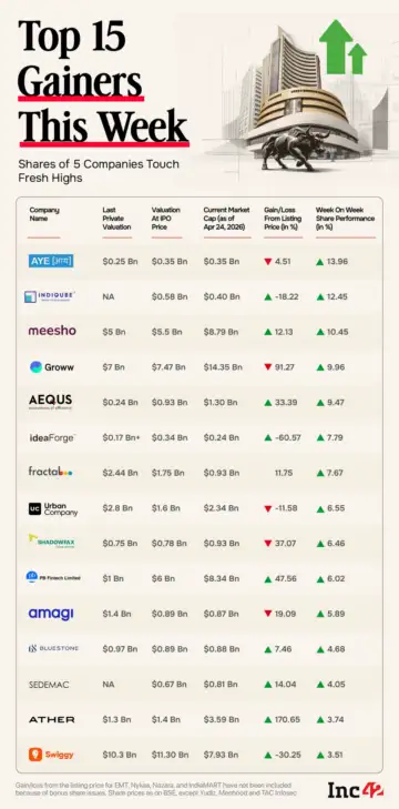 In the list of gainers, five stocks - Honasa Consumer, Shadowfax, Fractal, Aequs and Groww - touched fresh highs this week.