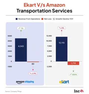 Ekart saw a decline in revenue, while Amazon’s logistics arm's revenuessoared by 7% YOY to INR 4,543 Cr, whereas the losses declined by 6.9% YOY to INR 80 Cr.
