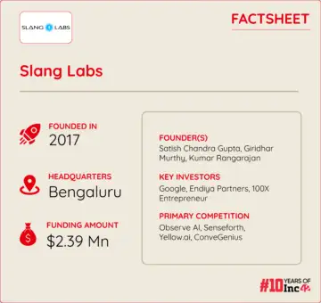 With a vision to enable users to communicate naturally with apps, with zilch language barriers, the cofounders incorporated Slang Labs. Today, the startup helps upgrade the potential of their clients' apps by making them smart enough to understand and respond to users’ queries in a number of languages, including Hindi, Kannada, Tamil, Malayalam, Spanish, and Vietnamese.