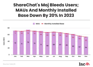 According to data sourced from app analytics platform Data.ai, the monthly active user base for Moj has fallen by nearly 23% from over 72 Mn in January 2023 to 54 Mn in December 2023.