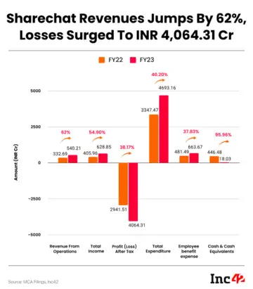 Against a revenue of INR 540 Cr in FY23, ShareChat posted a whopping loss of INR 4,064 Cr led by increased finance, server costs, employee payouts and other expenses.