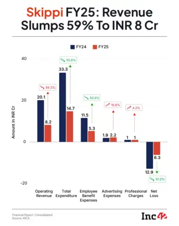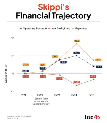 As a result, Skippi's operating revenue plunged 59% to INR 8.2 Cr in FY25 from INR 20 Cr in the previous fiscal year.