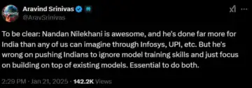 However, Srinivas doesn't agree with Nilekani. "… He’s (Nilekani) wrong in pushing Indians to ignore model training skills and just focus on building on top of existing models. (It is) essential to do both," Srinivas wrote in a separate post.