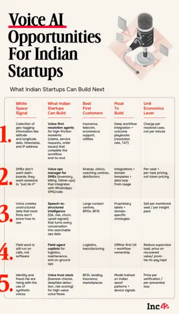 Voice AI white spaces in India are emerging where friction, urgency, and language complexity break app experiences. The most potent opportunities may lie in voice-first resolution for stressed users, code-mix native speech stacks for 'Hinglish', and regional switching.