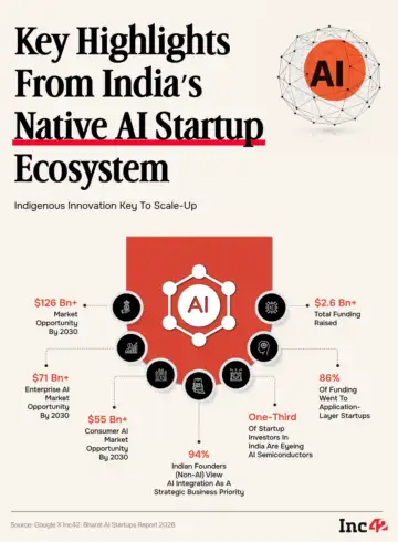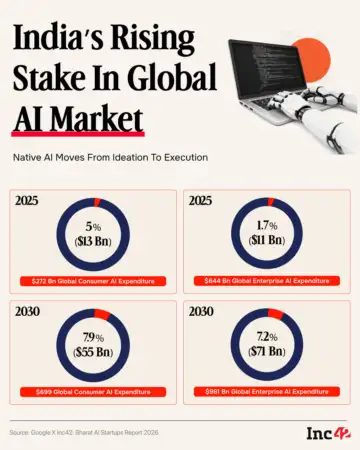 According to Google and Inc42's Bharat AI Startups Report 2026, India's AI market could become a $126 Bn opportunity by 2030, with a potential GDP impact of $1.7 Tn by 2035. Enterprise AI is expected to lead this growth, while consumer AI will scale rapidly on the back of strong adoption.