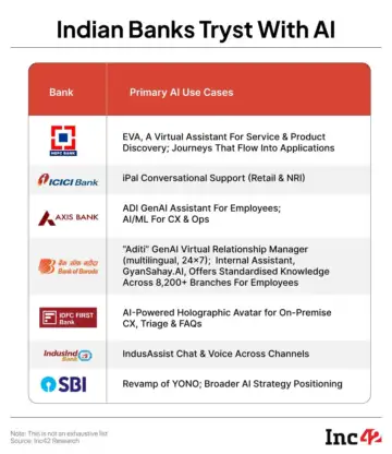 Analysts Inc42 spoke to noted that, although these are early days, the overall use case repository is already extensive. Some of the key areas where banks are experimenting with GenAI are sales and relationship growth, customer service, customer experience, documentation and automation, regulatory and compliance, decision support and business modelling, code development and more.