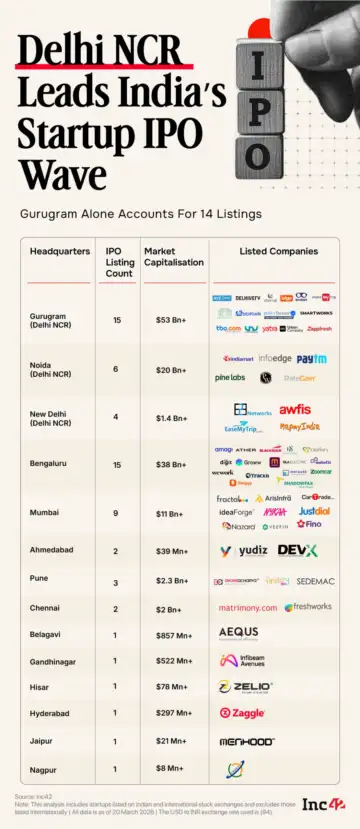 While thirteen companies, including Eternal, Delhivery, and Lenskart, call Gurugram their home, Awfis, EaseMyTrip, MapmyIndia and E2E Networks are from Delhi. Noida on the other hand is home to four listed new-age tech companies, including Paytm and IndiQube.