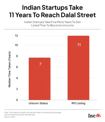 From a broad perspective, Inc42 data reflects that the median time taken for a startup to get listed on the bourses is 11 years. While listing for 18-year-old ixigo and 19-year-old Fino Payments Bank came relatively much later, ArisInfra's IPO materialised within four years of its operations.