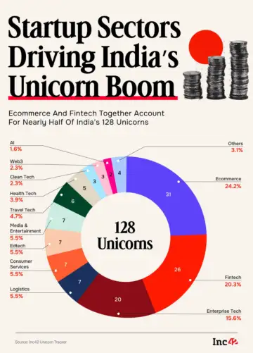 Ecommerce, fintech, and enterprise tech continue to anchor India's unicorn story. Of the 128 startups that have entered the unicorn club so far, 29 operate in ecommerce, 27 in fintech, and 20 in enterprise tech.