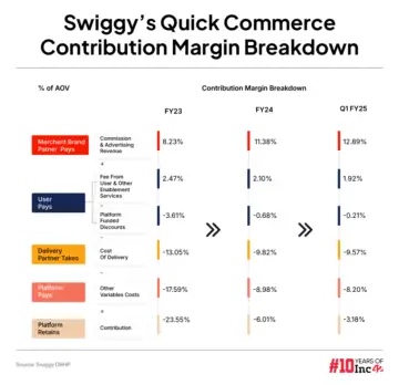 In terms of average order value, Swiggy Instamart has seen a significant growth from INR 398 in FY23 to INR 460 in FY24. On the other hand, in the food delivery vertical, the AOV has only seen a moderate increase from INR 416 in FY23 to INR 428 in FY24.