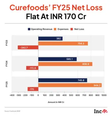 The loss saw only a marginal decline despite a healthy rise in the company's top line. Curefoods reported an operating revenue of INR 745.8 Cr in FY25, up 27.4% from INR 585.1 Cr in the previous fiscal year, as per its DRHP filed with SEBI.