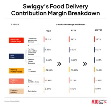 Further, Swiggy Instamart has also reduced the cost of delivery to improve its contribution margin. In FY23, the startup paid around 13.05% of the AOV of roughly INR 400 to delivery partners or roughly INR 52. This dropped by over 10% to INR 45.1 and the average order value shot up to INR 460. In the first quarter of FY25, the delivery cost further decreased to 9.57%, and the AOV shot up to INR 487.