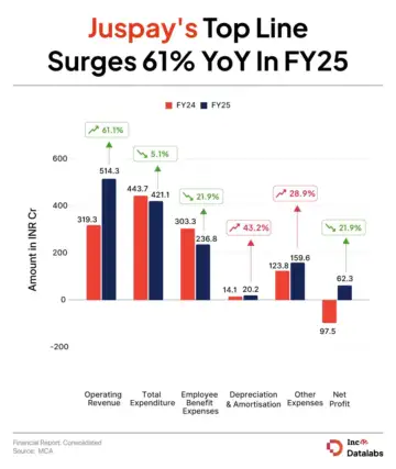 Even as its revenues surged, Juspay managed to bring down its overall cost base to deliver its first meaningful profit in years. The company's total expenses fell 5% to INR 421.1 Cr in FY25 from INR 443.7 Cr in FY24 led by reduction in people costs.