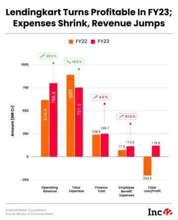 Lendingkart's operating revenue also jumped 29.5% to INR 798.4 Cr in the reported fiscal year from INR 616.4 Cr in FY22.
