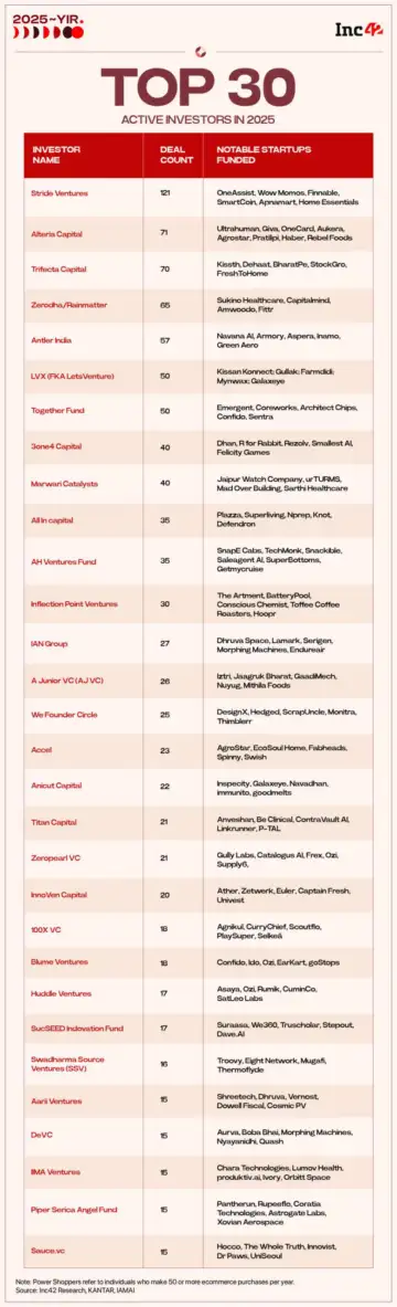 Venture debt firm Stride Ventures continued to remain one of the most active startup investors in 2025, backing 121 startups this year. It came up at second position in 2024 with 76 deals.