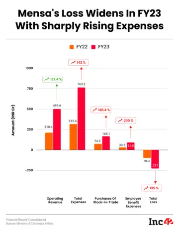 In line with the rise in operating revenue, the Indian entity of Mensa Brands saw its total expenses jump 142% to INR 763.2 Cr during the year under review from INR 315.4 Cr in FY22.