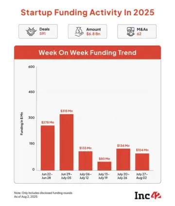 - Weekly Funding Drops: Between July 28 and August 2, Indian startups bagged $103.7 Mn across 14 deals, a 23% decline from the $134.4 Mn raised by 22 startups in the preceding week.