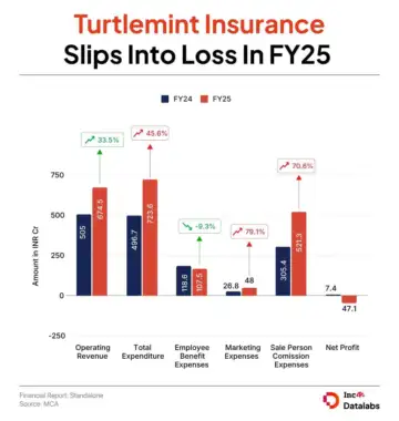 On the financial front, Turtlemint’s insurance arm, Turtlemint Insurance, slipped into the red, in FY25. It reported a net loss of INR 47.1 Cr as against a profit of INR 7.4 Cr in FY24. However, operating revenue jumped 33.6% to INR 674.5 Cr from INR 505 Cr in FY24.