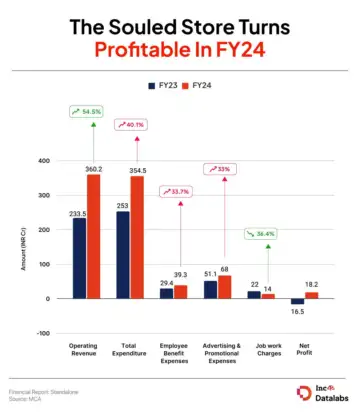 The Souled Store's total expenses grew 40.12% to INR 354.5 Cr from INR 253 Cr in FY23.