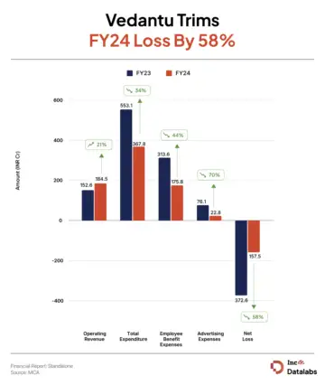 Edtech unicorn Vedantu's net loss declined 58% to INR 157.52 Cr in the financial year 2023-24 (FY24) from INR 372.64 Cr in the previous fiscal year on the back of growth in its top line and improvement in margins.