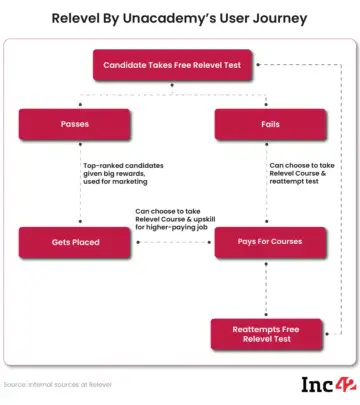 Because while the user journey ends with recruitment, in some cases, it takes a detour into paid courses. Relevel brought users in with the free tests and those who did not clear those tests were urged to sign up for courses priced between INR 90,000 to INR 2.5 Lakh.