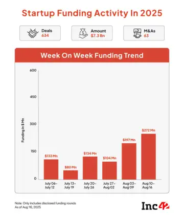 - Funding Galore: Investment activity across India's startup ecosystem gained further steam this week, buoyed by marquee deals. Between August 11 and 16, startups mopped up $272.1 Mn across 18 deals, up 38% from the $197.4 Mn garnered by 25 startups last week, even as deal count slipped 28%.