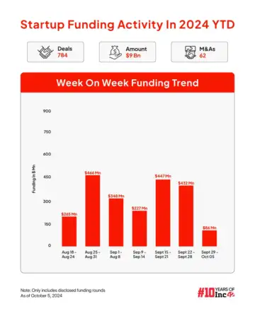 - After a drought of almost two years, the Indian startup ecosystem is showing signs of recovery, with startup funding growing by 2X YoY to $3.4 Bn in Q3 2024