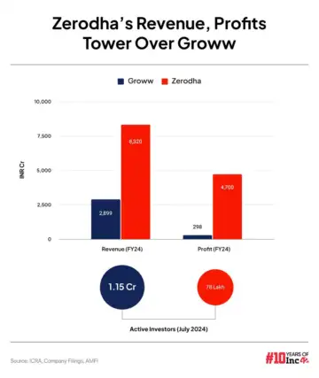 Speaking of profits, as we reported this week, Groww is likely to see a 4X YoY jump in its net profit to INR 297.8 Cr in FY24. Among startups, Groww is the closest to Zerodha, which had a sizable lead over the former with INR 4,700 Cr ($562 Mn) in profit for FY24. This is despite Groww having significantly more active investors.
