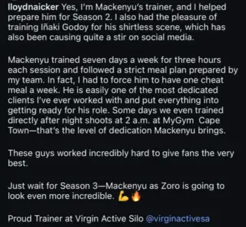 In fact, I had to force him to have one cheat meal a week. He is easily one of the most dedicated clients I've ever worked with and put everything into getting ready for his role. Some days we even trained directly after night shoots at 2 a.m. at MyGym Cape Town-that's the level of dedication Mackenyu brings. These guys worked incredibly hard to give fans the very best. Just wait for Season 3 - Mackenyu as Zoro is going to look even more incredible."