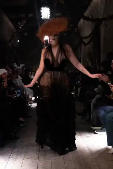 The show was an immersive, theatrical experience set in a shadowy underbelly of Paris. Galliano's muses were given extreme, cinched silhouettes, wore sheer, bias-cut gowns and used merkins (pubic wigs) on several of the models. The merkins were visible underneath the sheer fabrics, creating a shocking and powerful visual. They were reportedly fashioned from real human hair painstakingly embroidered onto silk tulle stockings, a true haute couture technique.