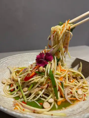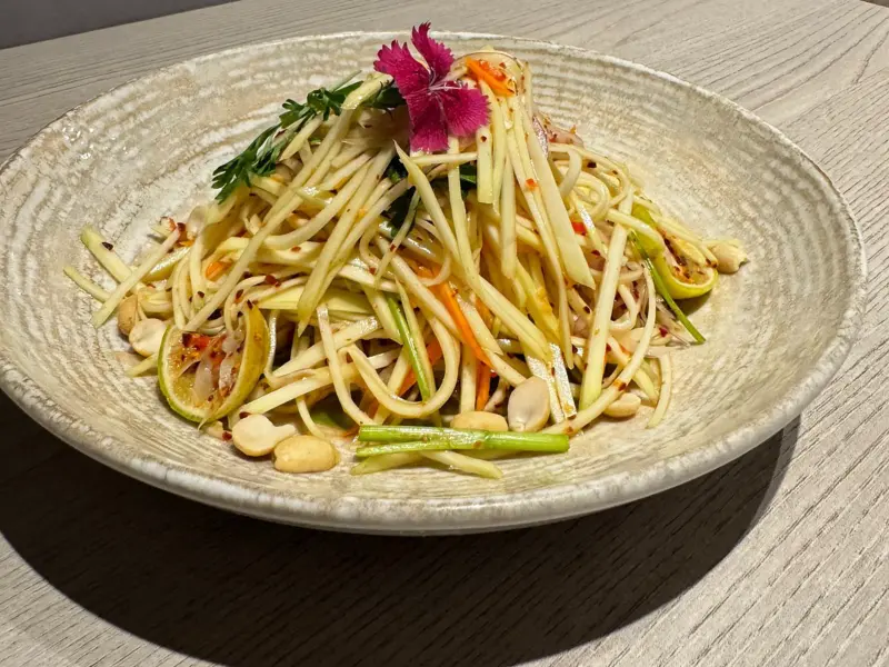 In a large bowl, combine julienned mango, carrot, onion, and chili flake Pour the dressing over and toss gently to coat.